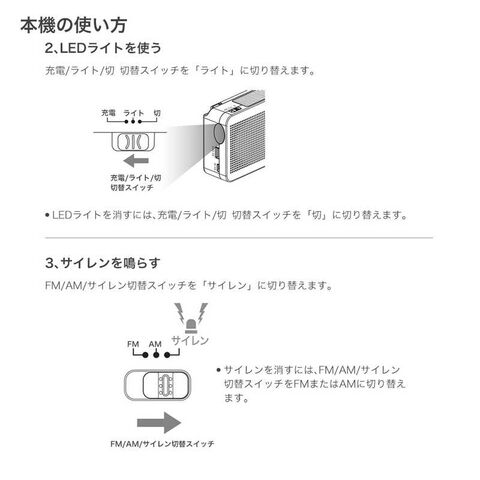 最長電池持続時間:ラジオ受信時 約14時間、LEDライト 約7時間、サイレン約7時間。