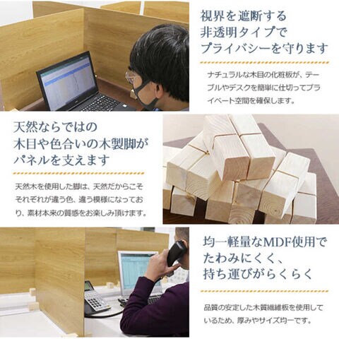 木目の化粧板が、テーブルやデスクを簡単に仕切ってプライベート空間を確保します。