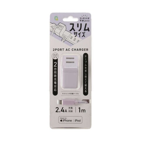 クオリティトラストジャパン 2.4A USB2ポート スリムACアダプタ Lightningケーブル付 パープル QL-0201PU