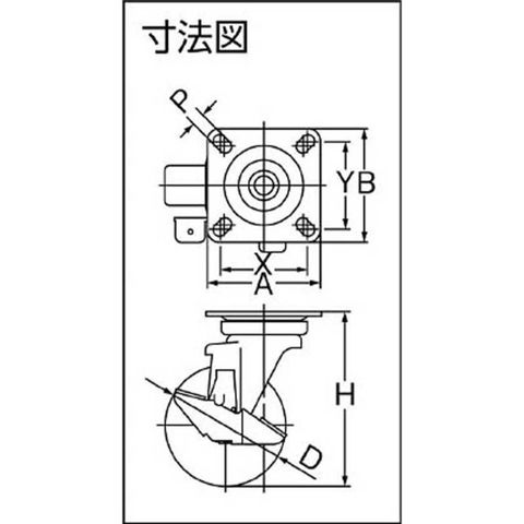 許容荷重(daN):80、許容荷重(kgf):81.6、車輪径D(mm):75、車輪幅(mm):32、取付高H(mm):103、取付座A×B(mm):82×82、取付ピッチX×Y(mm):63×63、取付穴径P(mm):9.5、質量(g):600