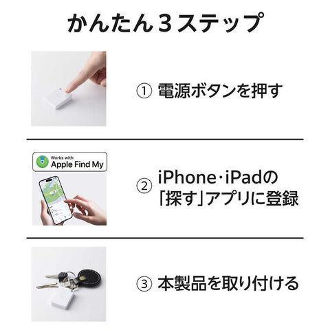 使い方はかんたん3ステップ!「電源ボタンを押す」「iPhone・iPadの『探す』アプリに登録」「大切な荷物に取り付ける」だけで完了です。位置情報はアプリからいつでも調べることができます。