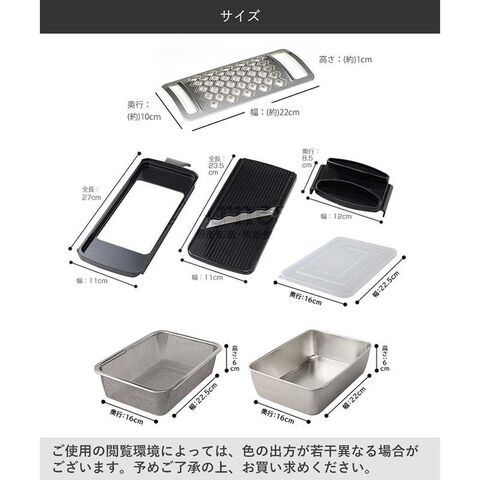 仕様3:【商品詳細】●セット内容:スライサー、スライサーホルダー、安全ホルダー、おろし金、深型バット、深型ザル、フタ/各1点●バット容量:約1.75L●ご使用上の注意を必ずお読みいただき、正しくお使いください。