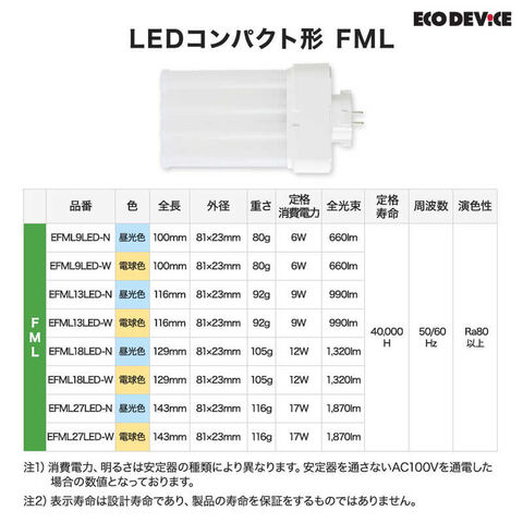 エコデバイス そのまま取り替えるだけ 27形 LED FML アース 電球色 EFML27LED-W
