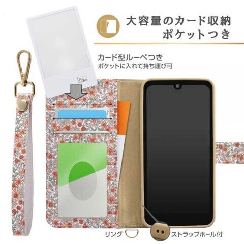 仕様1:材質:ポリウレタン素材、熱可塑性ポリウレタン樹脂、真鍮、ポリ塩化ビニル重量(約)g:93サイズ:約(高さ)×(幅)×(奥行)cm:15.3×8.1×2.2製品内容:耐衝撃 手帳型ケース クリアポケット ハンドストラップ ルーペ付 花柄