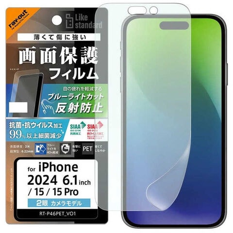 レイアウト iPhone 16/ 15/ 15 Pro Like standard PETフィルム ブルーライトカット 反射防止 衝撃吸収 抗菌・抗ウイルス 平面保護 指紋防止 RT-P46F/DK