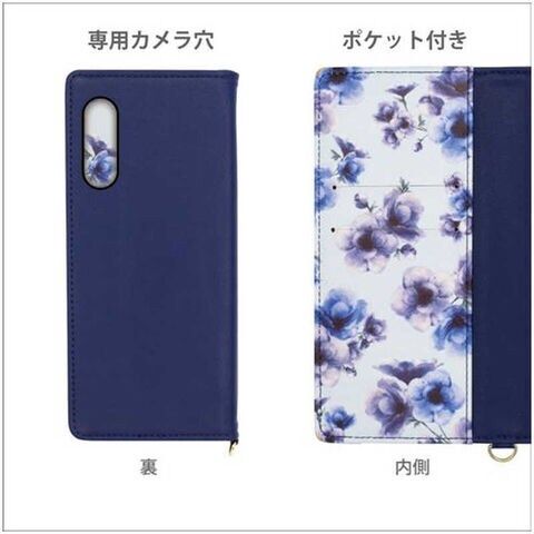 近通 手帳型ケース Xperia 10 II [フラワー柄/ストラップ付] Elegante ネイビー BL-XP10-206NV