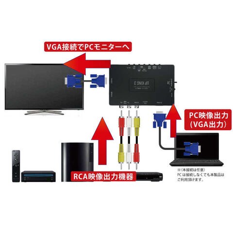 S端子やコンポジット端子(NTSC信号)出力をVGA(RGB信号)へ変換出力するコンバーターです。