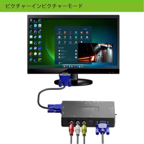 VGA信号画面に、コンポジット/S端子の映像をウィンドウ表示するピクチャインピクチャ機能を搭載。作業しながら、映像を閲覧したりと便利です。また、ウィンドウの大きさや位置を切り替えることが可能です。