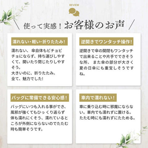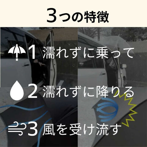ビル風も右から左へ受け流す強風仕様モデル。晴雨兼用。濡れるスキをつくらない、通常とは逆の特殊な構造で365日、雨も猛暑もお出かけを快適にする逆折りたたみ傘。車の乗り降りのスキ、傘を開いているスキ、傘を巻き取るスキ、そんなほんのわずかな濡れるスキをなくし、雨の日を快適にします。さらに、炎天下でも自分専用の避暑地ができる遮熱性と、99.9%の紫外線カットで猛暑も快適に。365日天気に左右されない快適な毎日を実現します。