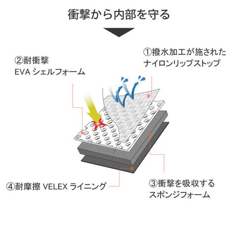 ●4層構造で、カメラや機材を衝撃と水からしっかりと守ります