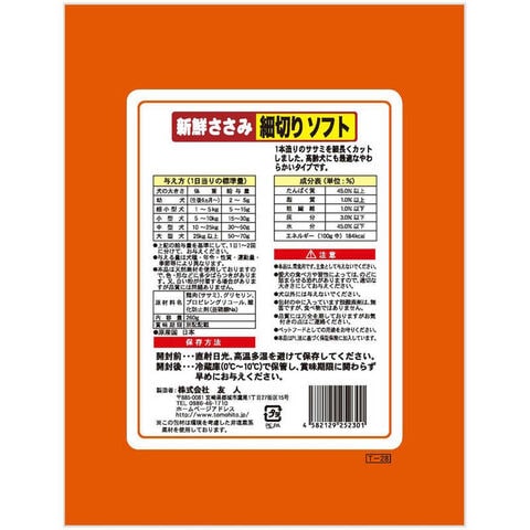 新鮮で良質なささみを使用した低脂肪スナックで、犬種を選ばないソフト仕上げにしており少量ずつ与えやすく、細切タイプに加工しております。