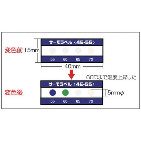原色:白、変色後色:赤橙/えんじ/青/濃藍、変色温度(℃):70-75-80-85、エレメントサイズ(φmm):5、シートサイズ(mm):15×40、質量(g):10