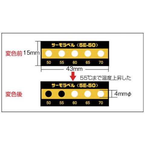 原色:白、変色後色:黒、変色温度(℃):75-80-85-90-95、エレメントサイズ(φmm):4、シートサイズ(mm):15×43、質量(g):10