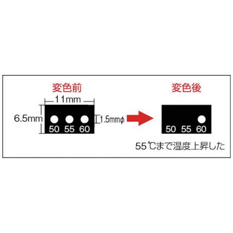 原色:白、変色後色:黒、変色温度(℃):80-85-90、エレメントサイズ(φmm):1.5、シートサイズ(mm):6.5×11、質量(g):8