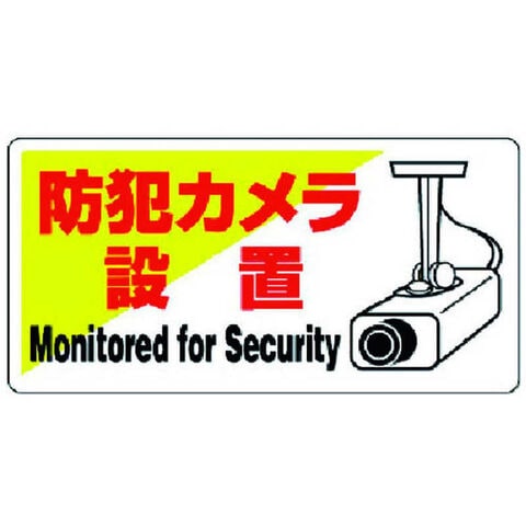 表示内容:防犯カメラ設置 Monitored for Security、取付仕様:穴4ヵ所、縦(mm):200、横(mm):400、厚み(mm):1.2、質量(g):100