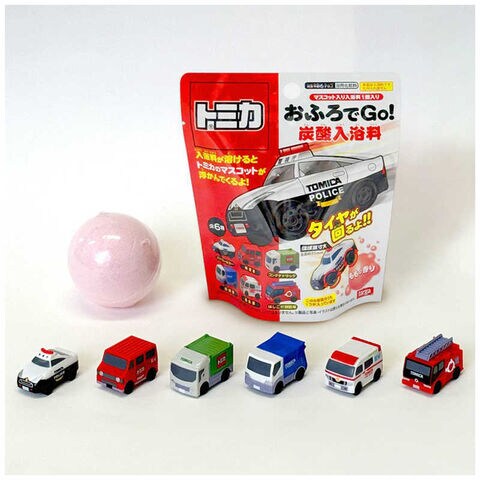 バスボール(ももの香り)が溶けると中からタイヤの回るトミカのマスコットが浮き出てくる商品です。