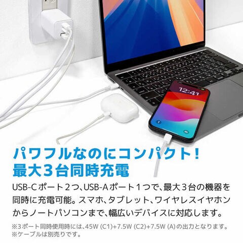 ※3ポート同時使用時には、45W (C1)+7.5W (C2)+7.5W (A)の出力となります。