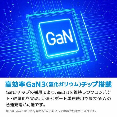 USB-Cポートを単独で使用した場合、最大65Wでの高出力・急速充電が可能です。
