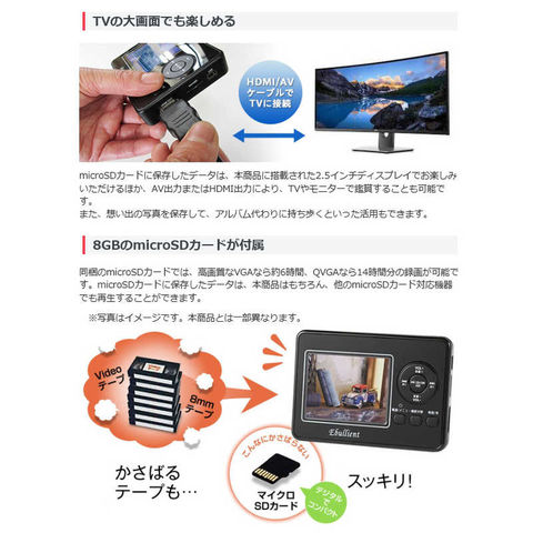 仕様2:入出力端子:外部出力3.5mm、外部入力3.5mm、イヤホン、マイクコード長さ:AVケーブル約113cm/USB電源ケーブル約84cm /HDMIケーブル約120cm消費電力:最大5W[8GBmicroSD]連続録画/再生約7時間(約2時間でフル充電)※録音時(VGA/QVGA:約2時間で一度区切られますので再度録音ボタンを押し必要があります。)[液晶サイズ]約2.5インチ