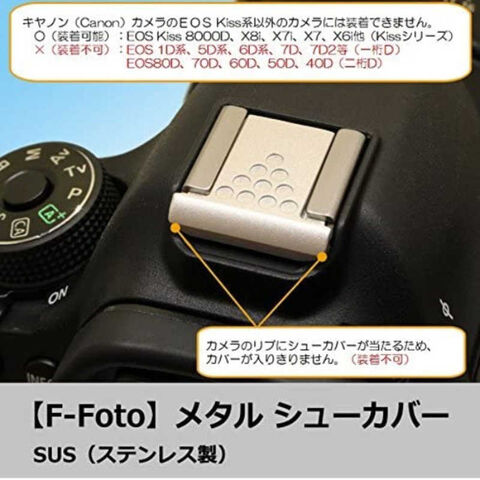 【装着できないカメラ2】キヤノンはEOS KISS系や8000Dには装着可能ですが、1D系、5D系、6D、7D系、40D~80Dまでの二桁D系には、カメラ手前のリブと干渉し、奥までシューカバーが入りきりません。