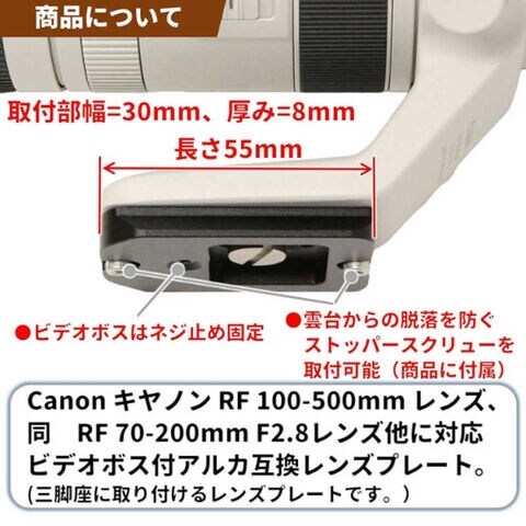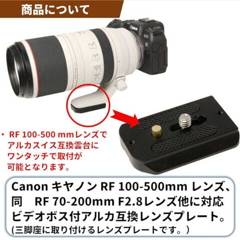 Canon キヤノン RFマウント 望遠ズームレンズ RF 100-500mm F4.5-7.1 IS USM レンズとRF 70-200mm F2.8 IS USM レンズに対応した ビデオボス付きのアルカスイス互換形状のレンズプレートです。該当レンズは雲台に取り付ける際は、ネジ止め式ですが、本品を使用する事で、ワンタッチで雲台への取付、取外しが可能となります。純正の三脚座の底面寸法に合わせた専用品です。純正の三脚座にはネジ穴とビデオボスに対応した穴が開いております。レンズプレートには、金属製のビデオボスと固定ネジが1本(1/4ネジ)がついておりますので、三脚座のビデオボス用の穴に、レンズプレートのボスを合わせ、ネジ穴に固定ネジを合わせて、コイン等を用いて、ネジを締めて固定してください。材質はアルミ製で切削加工後に硬質アルマイト仕上でブラックに着色されています。アルミブロックから削り出しで作成しておりますので、剛性が高く大変しっかりとした作りです。ビデオボスは真鍮製でネジで固定されておりますので、ボスの取外しも可能です。雲台に取り付けた際の脱落を防止するストッパーネジ2本と工具が付属します。本品は、RF 100-500 レンズ、RF 70-200 F2.8レンズだけでなく、キヤノンのビデオボス用の固定穴がついている他の商品にも取付が可能です。例えば、EOS R5用バッテリーグリップ BG-R10、EOS 5D MarkIV用バッテリーグリップ BG-E20、マウントアダプター EF-EOS M、EF 100-400mm F4.5-5.6L IS II USM(100-400 2型)など。バッテリーグリップに装着した場合でも、握った時に邪魔にならないようにプレートの長さ、形状を配慮しております。望遠レンズでの三脚への装着だけでなく、EOS R5等での静止画、動画撮影をそれぞれ行う際に、持ちやすさを邪魔する事無く、ビデオ雲台等に使用できるようなシチュエーションを想定しています。