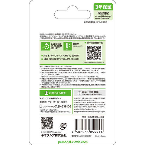 KIOXIA キオクシア SDXC microSDカード EXCERIA HIGH ENDURANCE G2(エクセリアハイエンデュランスG2) [Class10 /64GB] KEMU-B064GBK