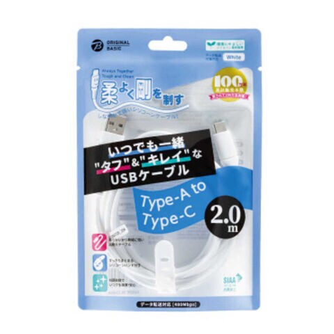 ORIGINALBASIC USB-Ato Type-Cケーブル 2m シリコーン素材 やわらかい 抗菌仕様 SIAA認証 ホワイト OB-UCS2AC200-W