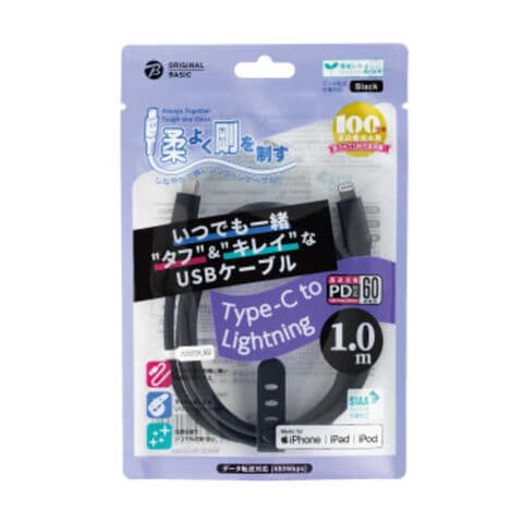 ORIGINALBASIC iPhone充電ケーブル Type-C to ライトニングケーブル 1m MFI認証 シリコーン素材 やわらかい 抗菌仕様 SIAA認証 ブラック OB-UCS2CL100-K