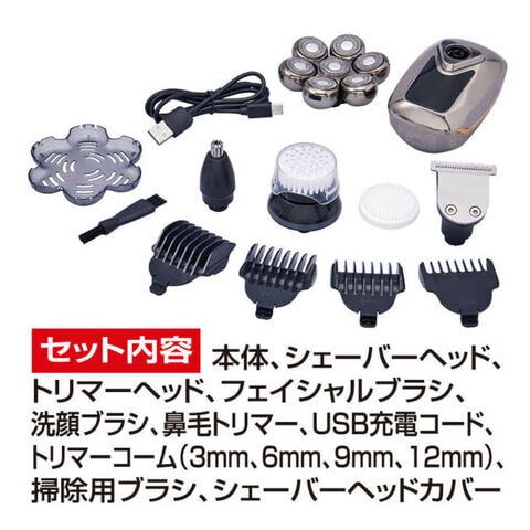 本体、シェーバーヘッド、トリマーヘッド、フェイシャルブラシ、洗顔ブラシ、鼻毛トリマー、USB充電コード、トリマーコーム(3mm、6mm、9mm、12mm)、掃除用ブラシ、シェーバーヘッドカバー