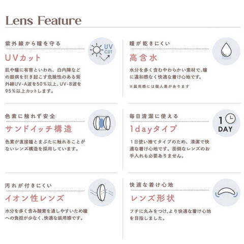水分を多く含むやわらかい素材で、瞳に違和感なく快適なつけ心地です。