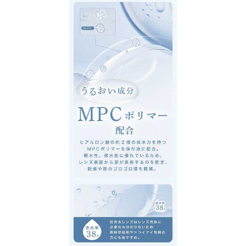 親水性、保水性に優れているため、レンズ表面から涙が蒸発するのを防ぎ、乾燥や目のゴロゴロ感を軽減。