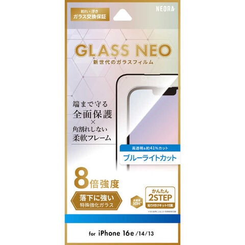MSソリューションズ iPhone 16e/ 14/ 13/ 13Pro ガラスフィルム GLASS NEO 全面保護 ソフトフレーム ブルーライトカット BM-ISS24FGSB