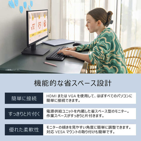 また、電源供給ユニットとケーブル ホルダーを内蔵した省スペース型のモニターで、作業スペースがすっきりと片付きます。