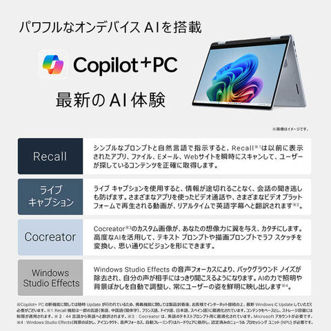 OS:Windows 11 Home ※Copilot+PCの新機能に関しては随時Updateが行われているため、掲載機能に関しては製品到着後、お客様でインターネット接続の上、最新Windows にUpdateしていただく必要がございます。