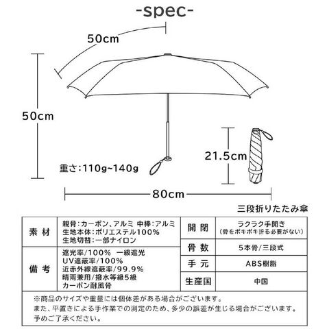 高級傘でよく使用されるカーボンファイバーを採用!直径80cmの大きさで完全遮光なのに重さはわずか115g-139gです!突然の雨や思わぬ日射しに大活躍してくれます。