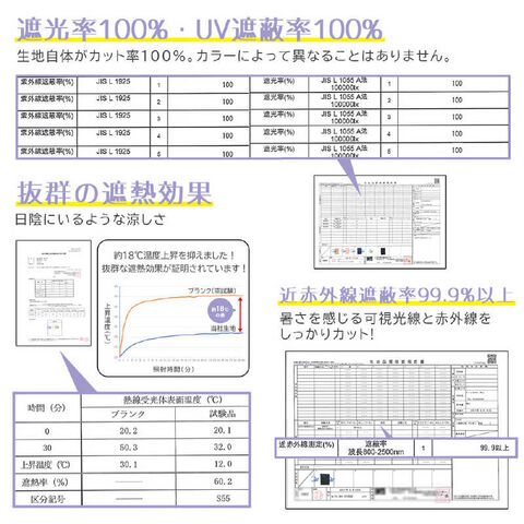 日本繊維製品品質技術センターにおいて、遮光率100%、UVカット率は100%、遮熱効果、撥水5級の最高ランクとの高機能タイプの晴雨兼用傘と証明済み。