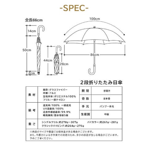 サイズ:全長:66cm 収納時の長さ:44cm 親骨:50cm 直径:88cm