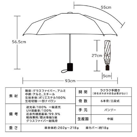 サイズ:全長:56.5cm 収納時の長さ:27cm 親骨:55cm 直径:93cm