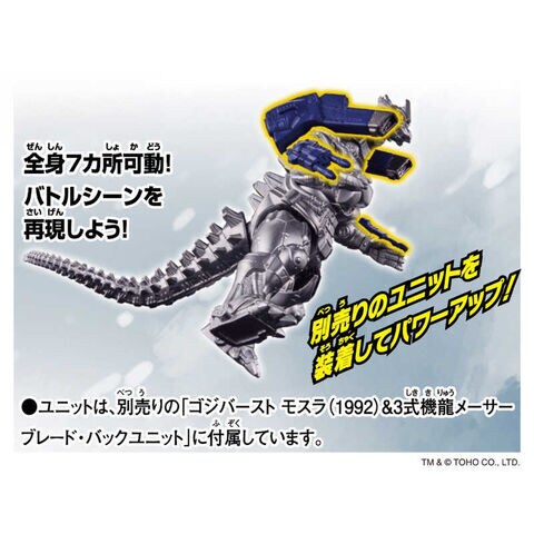 集めて広がる怪獣バトルの世界!手のひらサイズで『ゴジラ』の世界観を楽しめる新フィギュアシリーズ「ゴジバースト」より「3式機龍」が登場! 特徴的なギミックや可動が搭載されており、「3式機龍」は全身7カ所が可動!同シリーズ(別売り)のメーサーブレードとバックユニットを装着することで、重武装型も再現可能です。