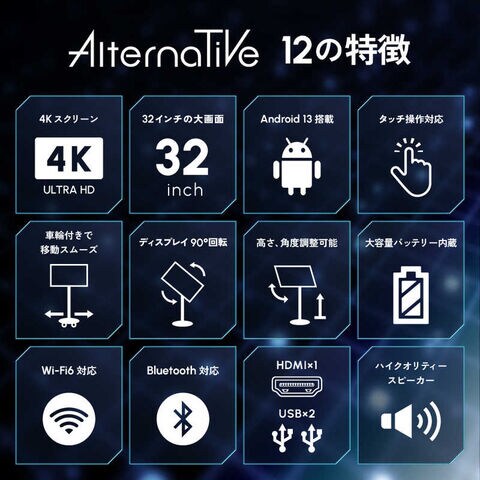 仕様1:[モニターサイズ]32インチ[アスペクト比]16:9[解像度]4K(3840×2160) ※ただし、一部動画配信アプリはアプリ自体の設定に基づき解像度FHD~SDとなります[コントラスト比]3000:1[リフレッシュレート]60Hz[色域]sRGB 100%[HDR]非対応[SoC]RK3588S-D[GPU]Mali-G610 MP4(クアッドコア)[RAM]8GB LPDDR4X[ROM]128GB[スピーカー]3W×2