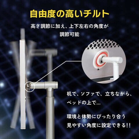 高さ・角度調整が可能なスタンドとローラー付きの台座により、設置や移動もスムーズ。