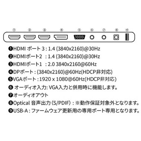 垂直走査周波数(Hz):[リフレッシュレート]60HzDisplay Port:@60Hz(HDCP非対応)HDMI 2.0:@60HzHDMI 1.4:@30HzVGA:@60Hz(HDCP非対応)