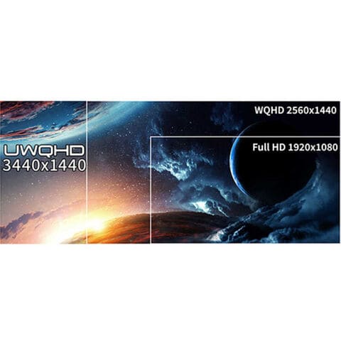 UWQHD(3440x1440)解像度はフルHDの約2.4倍の高解像度を実現、水平解像度はフルHDより80%広く、ゲームプレイ時だけでなく、デスクワークに使用時にも高い生産性を実現できます。