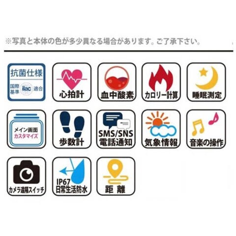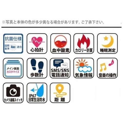機能面では、歩数/距離/カロリー、天気情報、音楽操作、着信通知機能(Facebook、電話、LINE、Instagram、長座注意)に安心機能である心拍計/血中酸素測定機能をプラスしております。