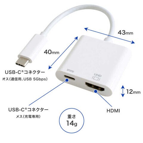 仕様1:[USBインターフェース] USB-Cコネクター オス×1(通信用、USB 5Gbps) USB-Cコネクター メス×1(充電専用※) ※充電専用端子にはUSB機器を接続しても動作しません。[HDMIインターフェース] Type-A×1(19ピン メス)[解像度]最大 3840×2160/60Hz[表示モード]拡張モードおよび複製モード ※iPhoneシリーズ、iPad Air、iPad Proは複製モードのみ対応。[HDR]非対応
