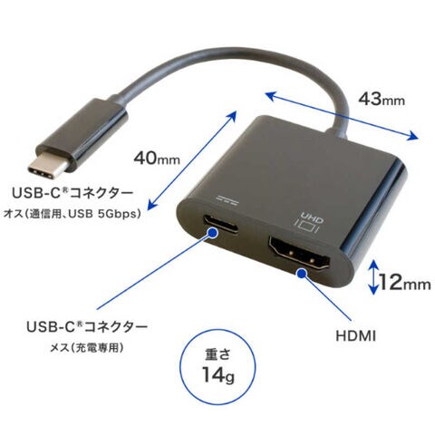 仕様1:[USBインターフェース] USB-Cコネクター オス×1(通信用、USB 5Gbps) USB-Cコネクター メス×1(充電専用※) ※充電専用端子にはUSB機器を接続しても動作しません。[HDMIインターフェース] Type-A×1(19ピン メス)[解像度]最大 3840×2160/60Hz[表示モード]拡張モードおよび複製モード ※iPhoneシリーズ、iPad Air、iPad Proは複製モードのみ対応。[HDR]非対応