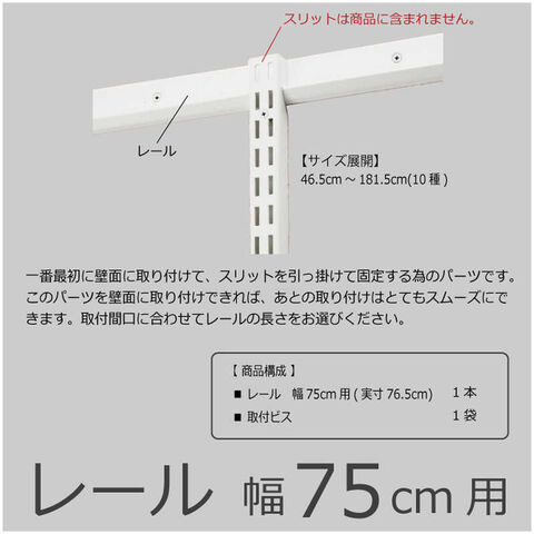 仕様3:・本体サイズ: W765mm・製品重量: 0.8kg・カラー: ホワイト・梱包内容: 1.レール幅75cm用(実寸76.5cm) 1本 2.取付ビス 1袋