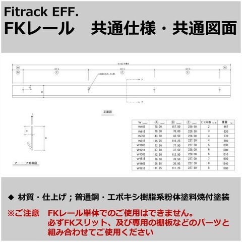 仕様2:・パーツ毎の注意: ※FKレール単体でのご使用はできません。必ずFKスリット、及び専用の棚板などのパーツと組合せてご使用ください。