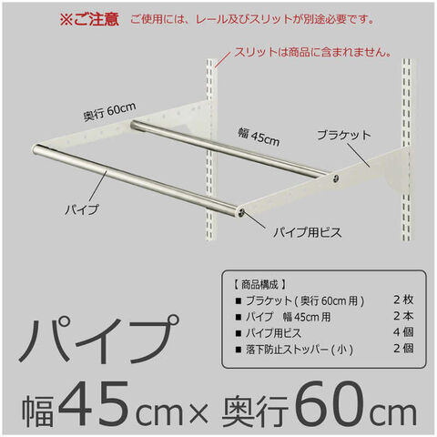 仕様3:・本体サイズ: W450×D600mm・製品重量: 1.8kg・耐荷重: 1セットにつき25kg(パイプ数量関係なくトータルの荷重となります。)・カラー: ブラケット: ホワイト・仕様: 金属ブラケット仕様・梱包内容: 1.ブラケット(奥行き60cm用) 2枚 2.パイプ 幅45cm用 2本 3.パイプ用ビス 4個 4.落下防止ストッパー(小) 2個