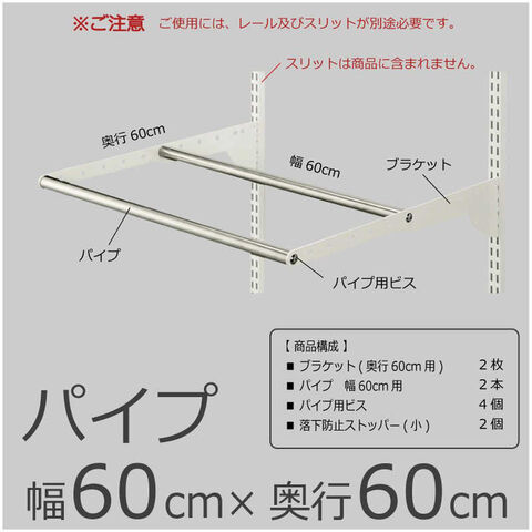 仕様3:・本体サイズ: W600×D600mm・製品重量: 1.9kg・耐荷重: 1セットにつき25kg(パイプ数量関係なくトータルの荷重となります。)・カラー: ブラケット: ホワイト・仕様: 金属ブラケット仕様・梱包内容: 1.ブラケット(奥行き60cm用) 2枚 2.パイプ 幅60cm用 2本 3.パイプ用ビス 4個 4.落下防止ストッパー(小) 2個